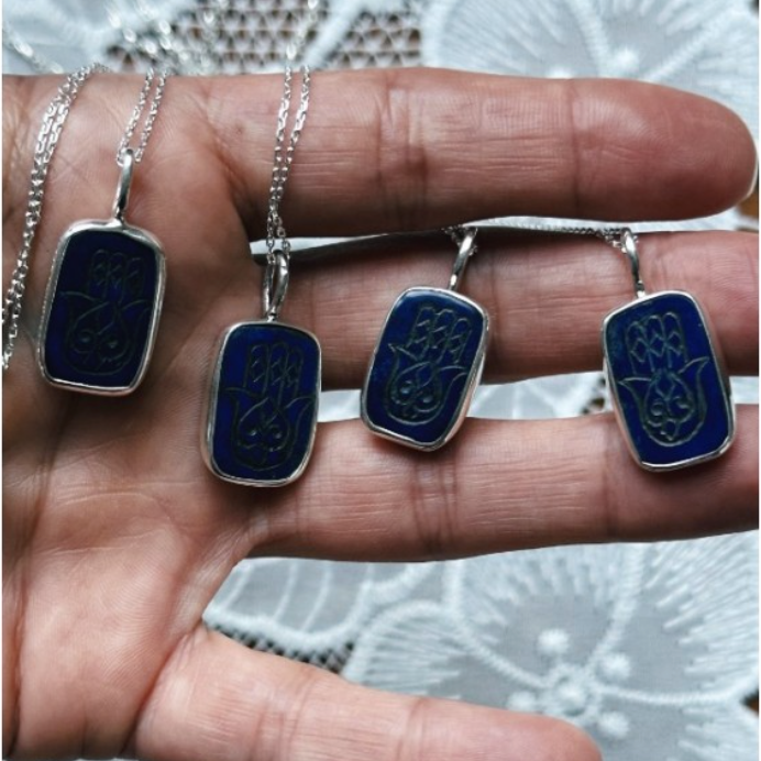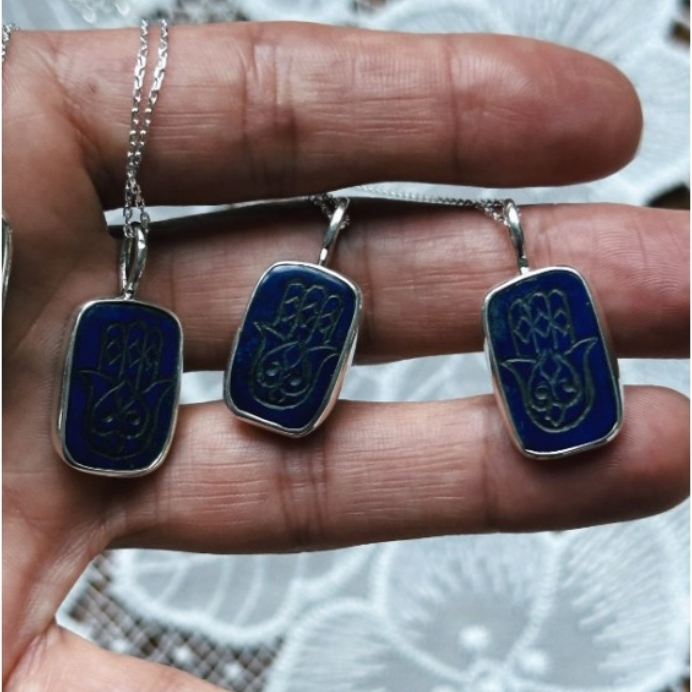 nazar eli kolye, fatma ana eli kolye, lapis lazuli kolye, el yapımı gümüş kolye, mistik sembol takı, özel işleme kolye, koruyucu tılsım kolye, kadın kolye modelleri