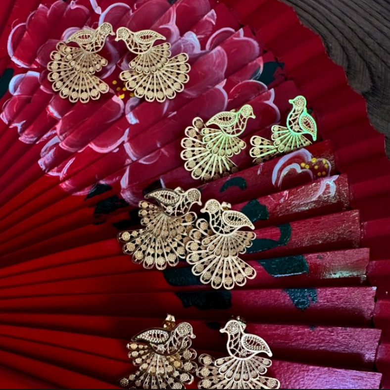 tavus kuşu küpe, pirinç altın kaplama küpe, el işçiliği takılar, anadolu motifli küpe, mistik figürlü takılar, vintage pirinç küpe, geleneksel takı modelleri, bereket sembolü takı