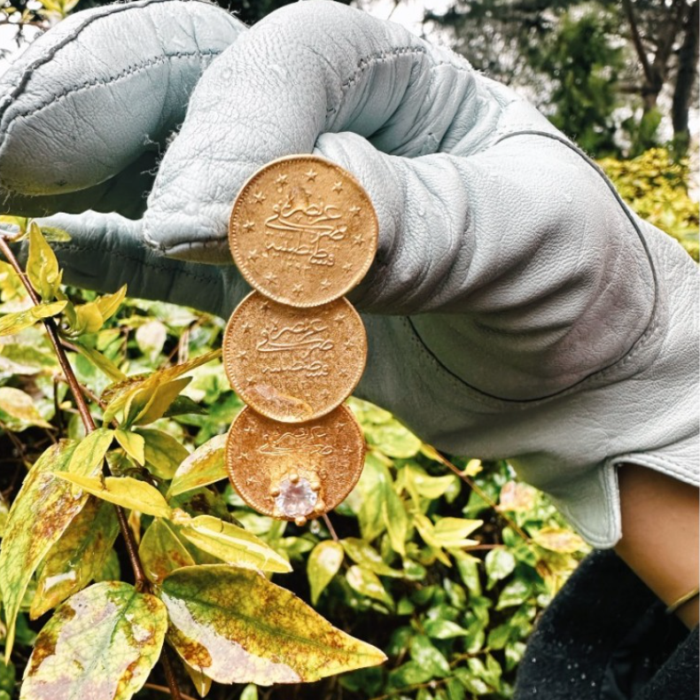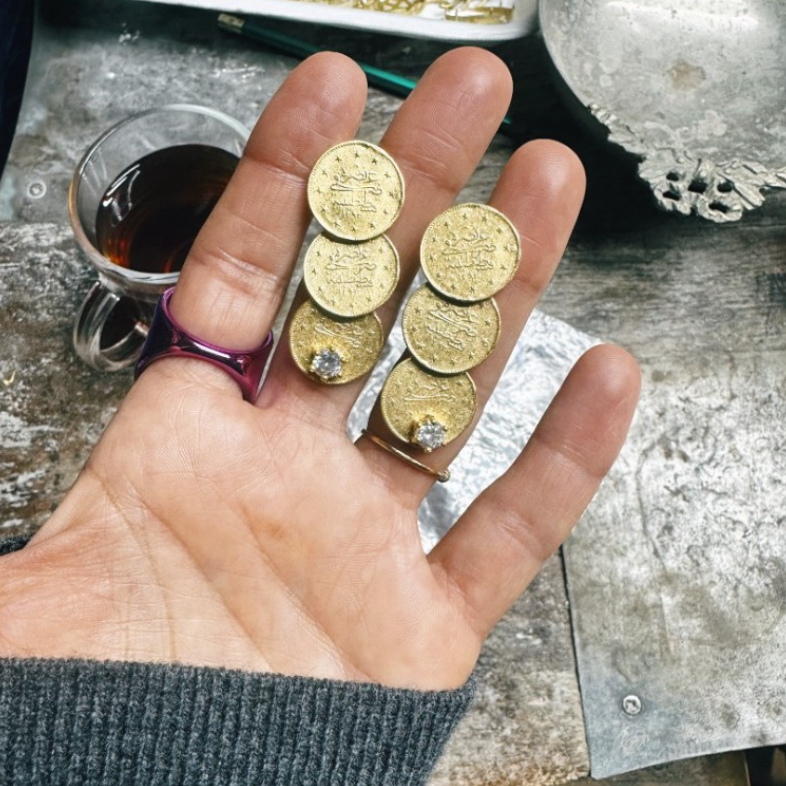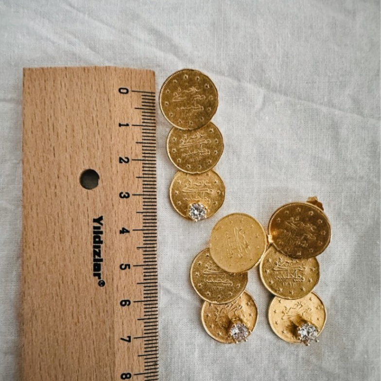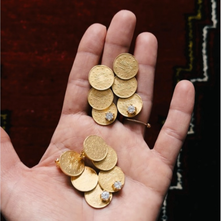 Eski Osmanlı sikkelerinden ilham alan yüzeyiyle Zerre Küpe, geçmişin izlerini modern bir zarafetle buluşturuyor. Üzerindeki ince kaligrafik desenler, tuğrayı andıran hat sanatının soyut izlerini taşırken; zirkon taşların ışıltısı bu tarihsel dokuyu günümüze taşıyor. Her bir detayı, ışığın ve geleneğin ince bir hatırası gibi parlıyor.